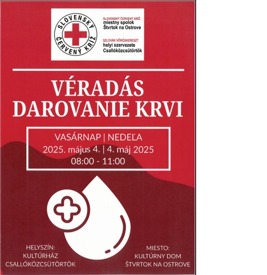 Miestna organizácia ČK vo Štvrtku na Ostrove Vás pozýva na darovanie krvi, ktoré sa uskutoční v nedeľu 4 mája 2025 od 8:00 do 11:00 hodiny v KD ŠnO.