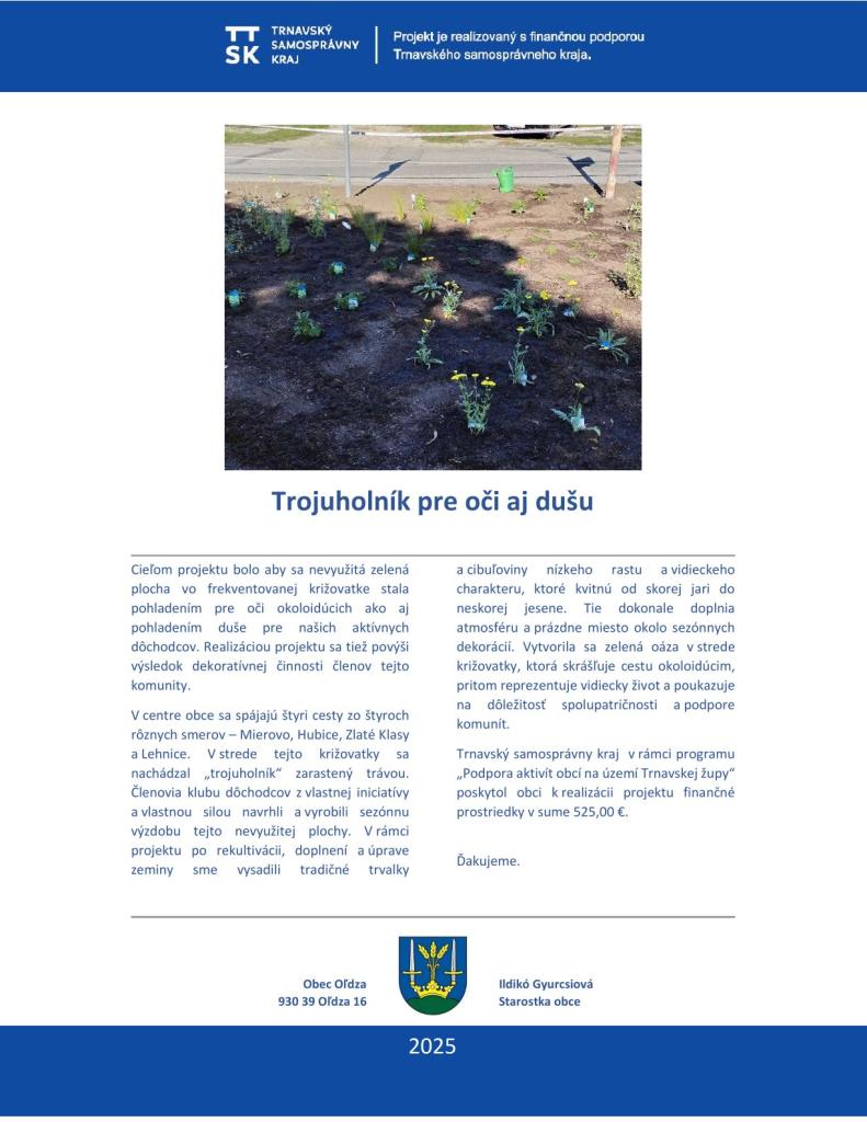 Trnavský samosprávny kraj v rámci svojho programu "Podpora aktivít obcí na území Trnavskej župy prispel obci Oľdza na realizáciu projektu "Trojuholník pre oči aj dušu".